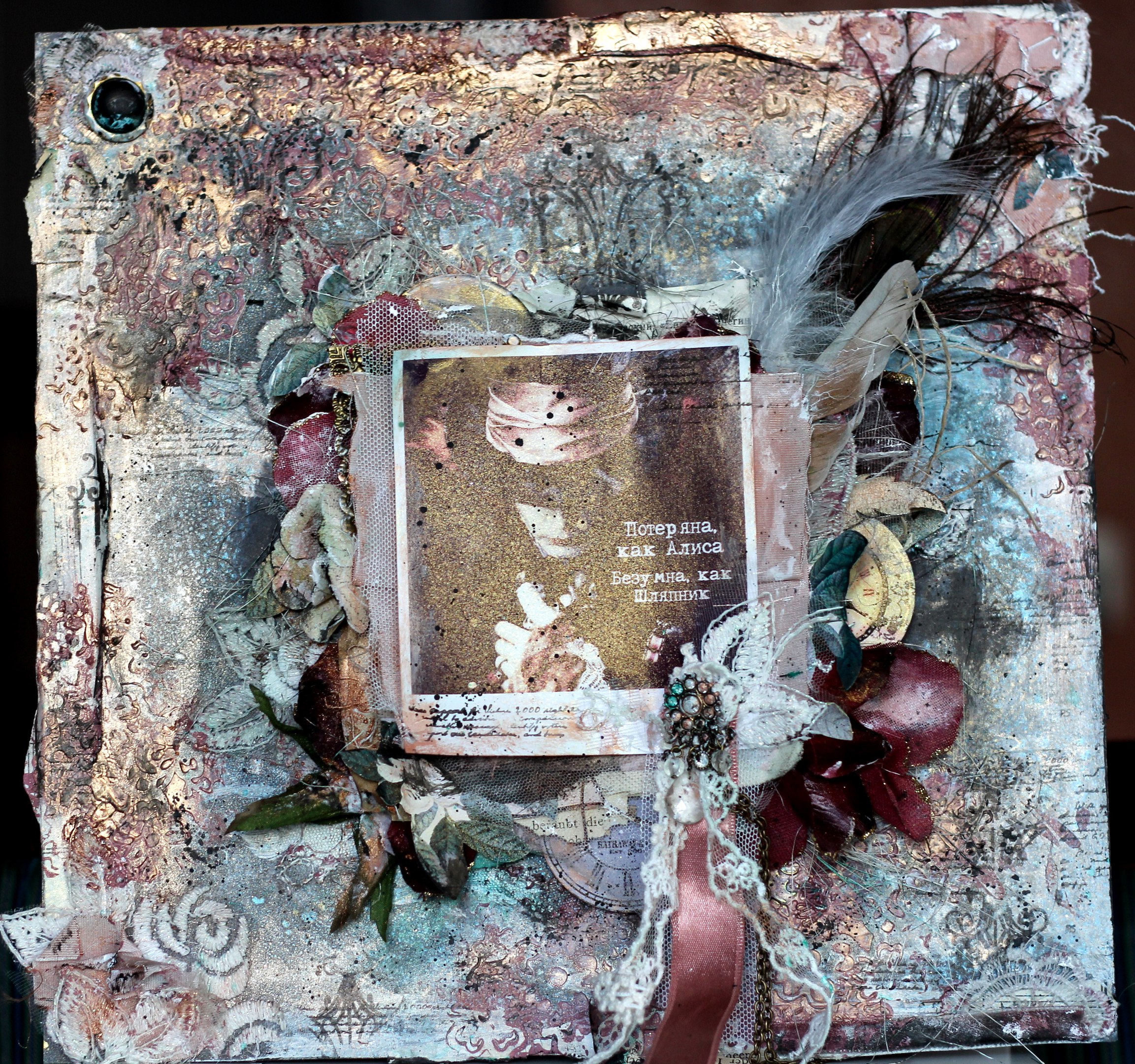 Холст - 20 на 25 см, из основных материалов - спреи и пудры для эмбоссинга Lindys, бумага и стикер 7Dots Studio, пасты, медиумы, топпинги и цветы - Prima Marketing, чипборд - самых разных производителей.